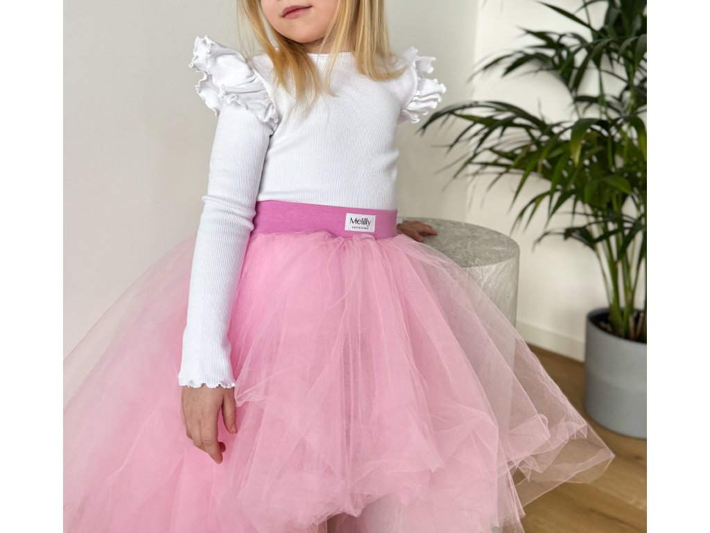 Žebrované tričko s dlouhým rukávem a volánky na ramenou. Elastický materiál, který přiléhá na tělo a zároveň je dostatečně dlouhé.