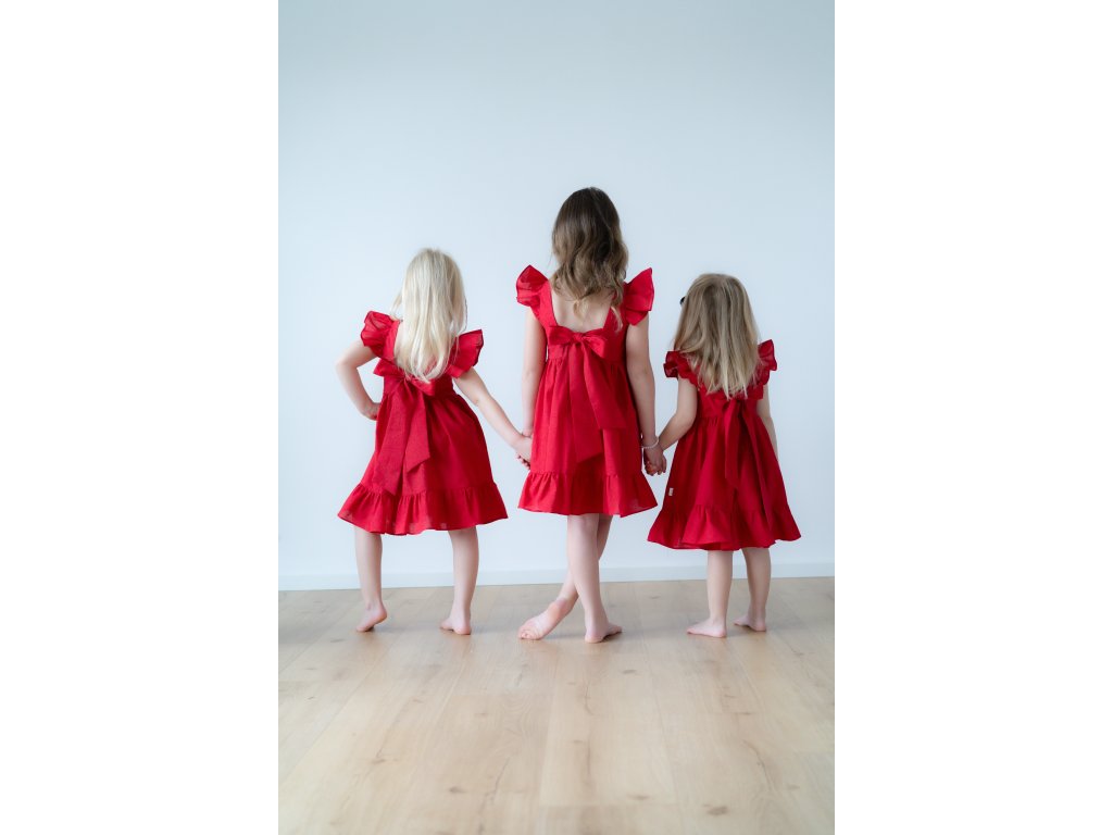 Krásné červené šatičky pro malé princezny, ideální nejen na Vánoce, ale také kdykoliv během roku. Jsou jedinečné díky volánkům a velké mašli na zádech, která umožňuje velikost šatů lehce upravit podle potřeby. Díky volnějšímu střihu se šatičky krásně přizpůsobí postavě dítěte a pro pohodlné oblékání můžete šaty stáhnout přes hlavičku nebo obléci odspodu, podle toho, co děťátku vyhovuje. Jsou ušité z kvalitního bavlněného plátna, které jim dodává nadýchaný vzhled a přitom zůstávají stále pohodlné. Každá část šatiček je propracovaná do největších detailů.