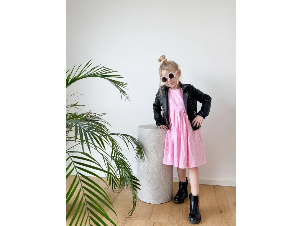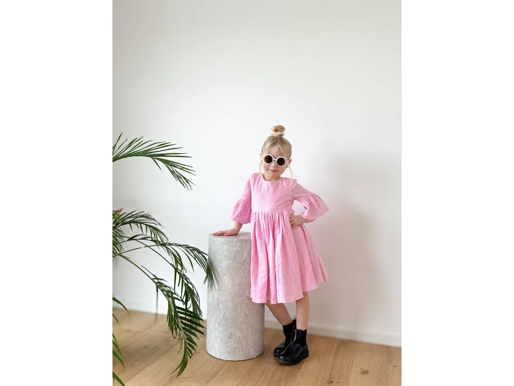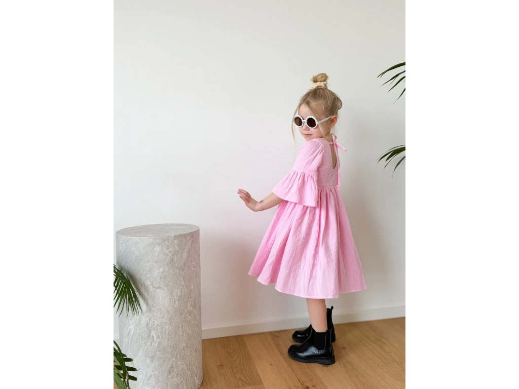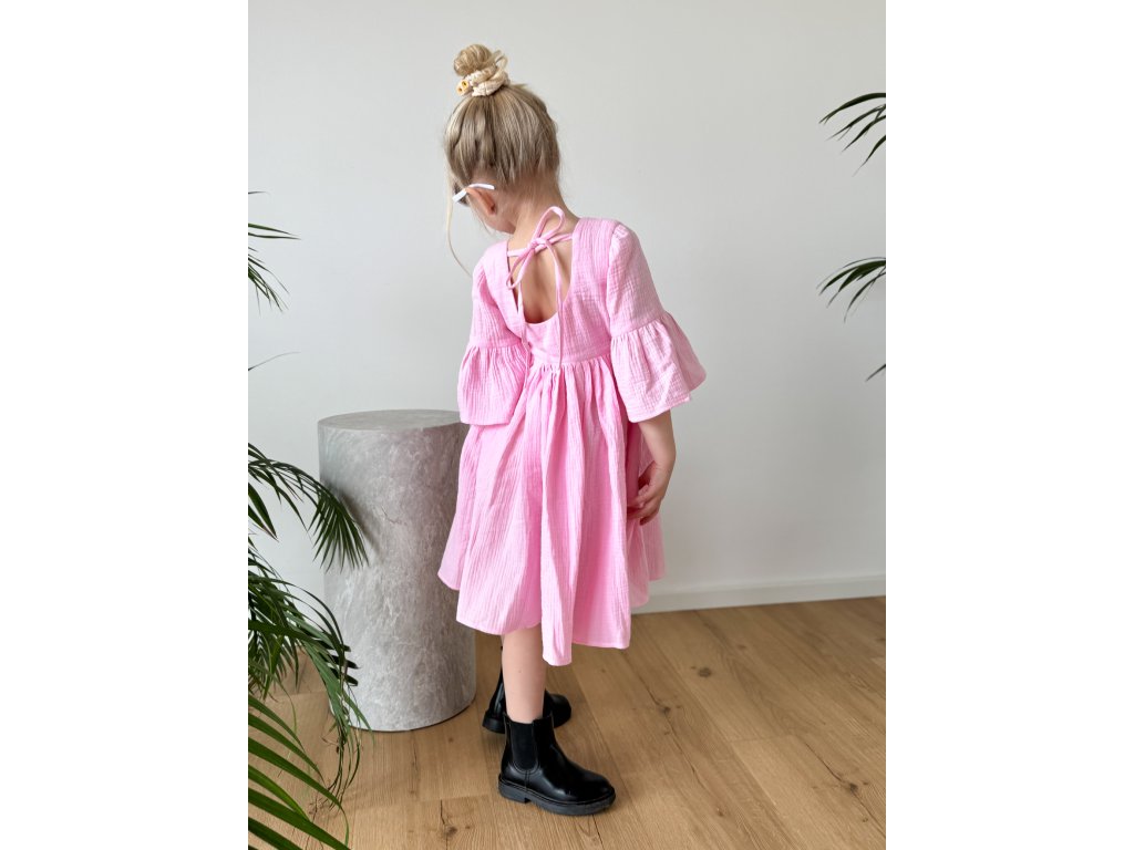 Tyto růžové mušelínové šaty jsou oblíbeným kouskem, který se unosí v každém ročním období. Na jaře krásně ladí s punčocháči a jarní bundičkou, v létě je dětičky mohou nosit jen tak nebo s podkolenkami a džískou. Šaty jsou příjemné na nošení, bohatě nařasené a krásně se točí. Vzadu je jemný kulatý výstřih a roztomilá mašlička na zavázání. Šatičky mají krásný střih a zpracování.