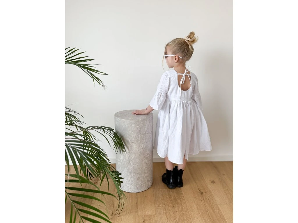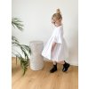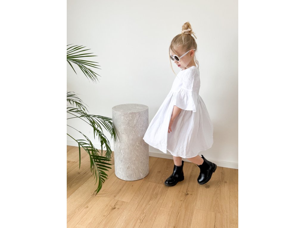 Tyto bílé mušelínové šaty jsou oblíbeným kouskem, který se unosí v každém ročním období. Na jaře krásně ladí s punčocháči a jarní bundičkou, v létě je dětičky mohou nosit jen tak nebo s podkolenkami a džískou. Šaty jsou příjemné na nošení, bohatě nařasené a krásně se točí. Vzadu je jemný kulatý výstřih a roztomilá mašlička na zavázání. Šatičky mají krásný střih a zpracování.