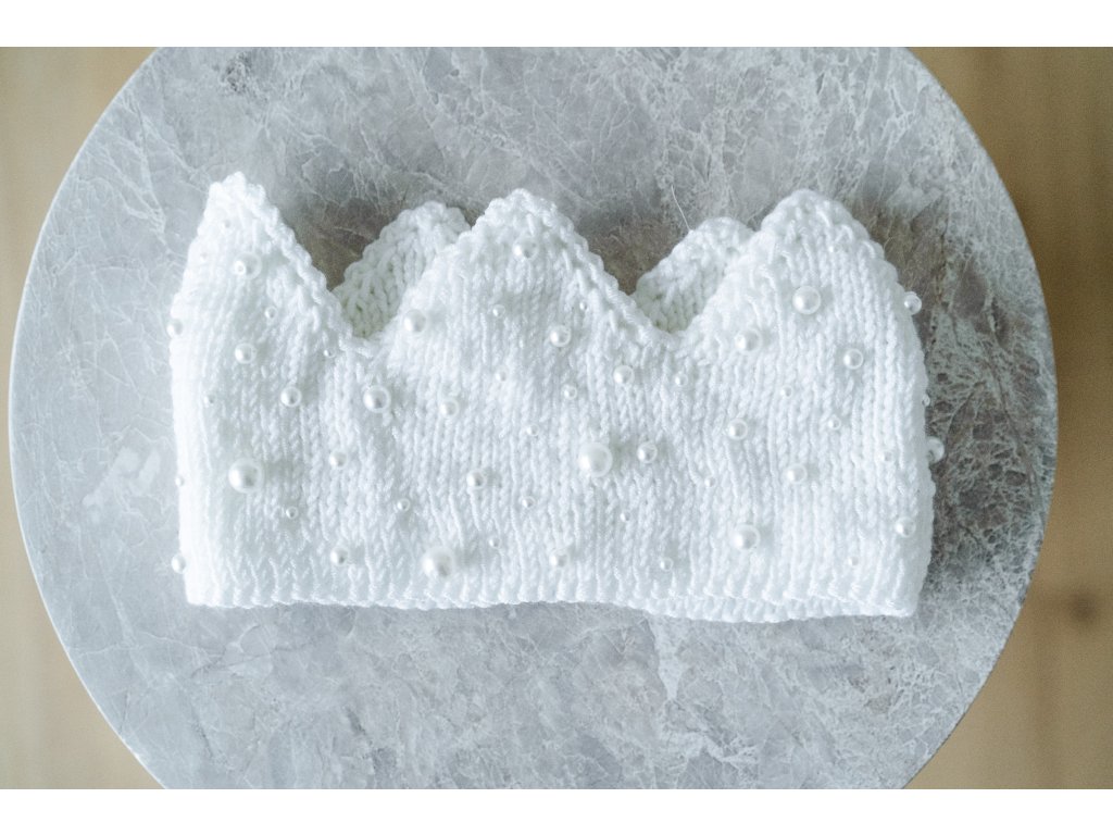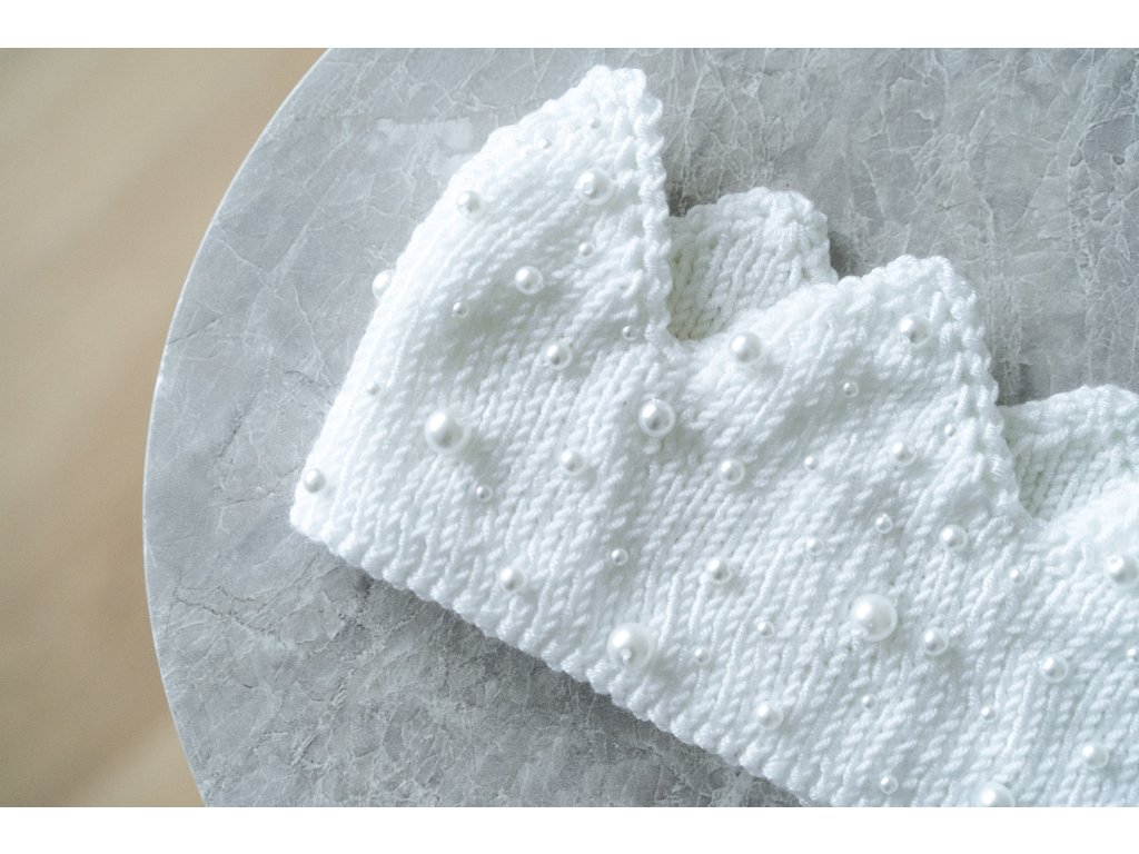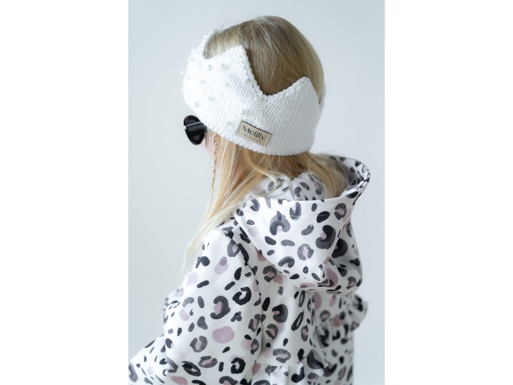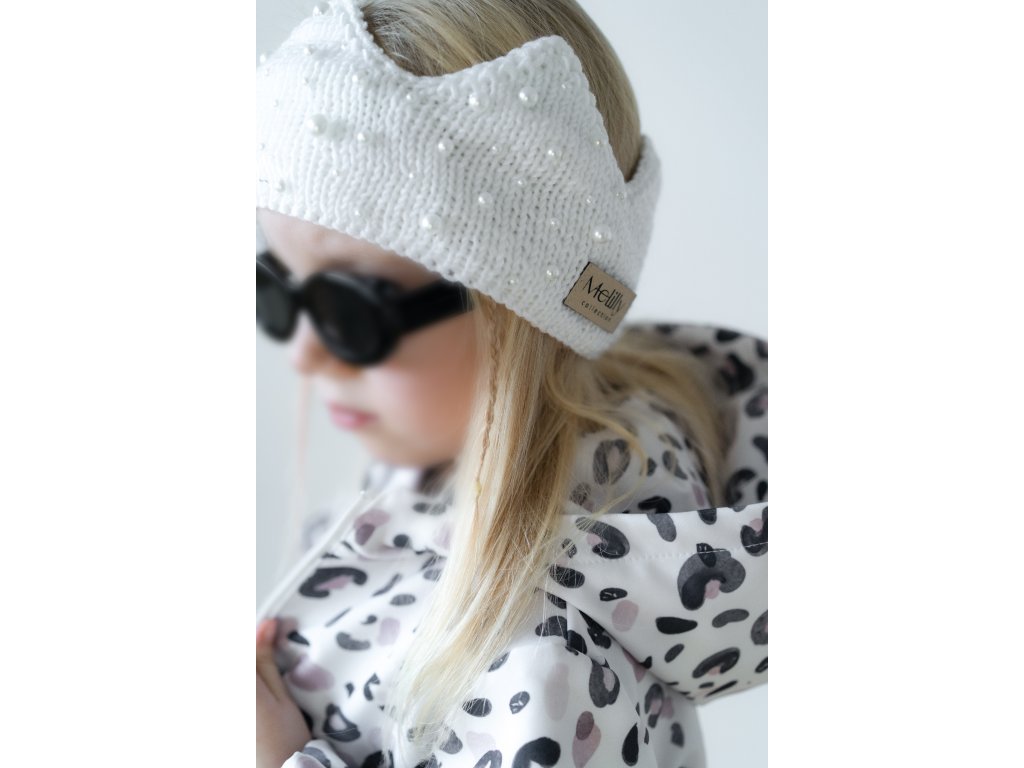 Ručně pletená zimní dětská čelenka s našitými perličkami. Čelenka je pletená v Česku z měkké a hřejivé příze, která krásně pruží a přizpůsobí se tvaru hlavičky. Čelenka má bílou barvu s béžovým logem. Každý kus je originál.