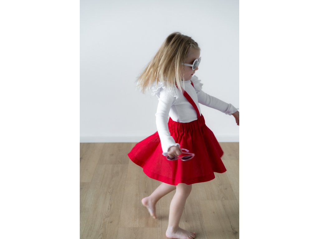 Sukně s ramínky v krásné červené barvě ze 100% bavlny, sukýnka má pohodlný pas na gumu. Ramínka se kříží na zádech a dodávají sukni zajímavý a roztomilý vzhled. Ramínka jsou nastavitelná díky knoflíkům na dvě délky. Díky výjimečnému materiálu působí sukně vzdušně a bohatě. Sukni můžete kombinovat s bílým tričkem a podkolenkami.